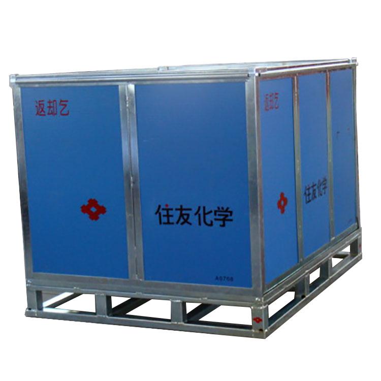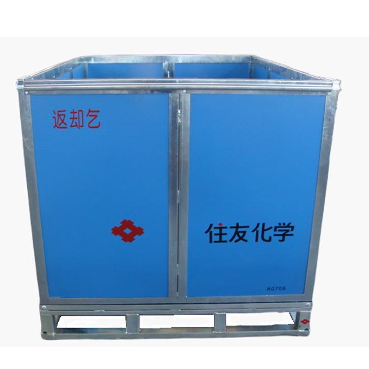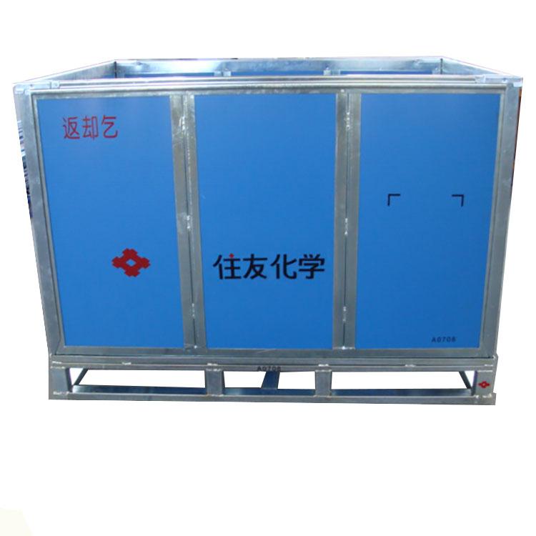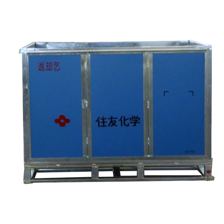 它是由铁框与高强度的PP中空板组成的。使用PP中空板可以有效减轻箱子的自重,同时又可以达到承重的目的。主要用于化工原料的装载。 |